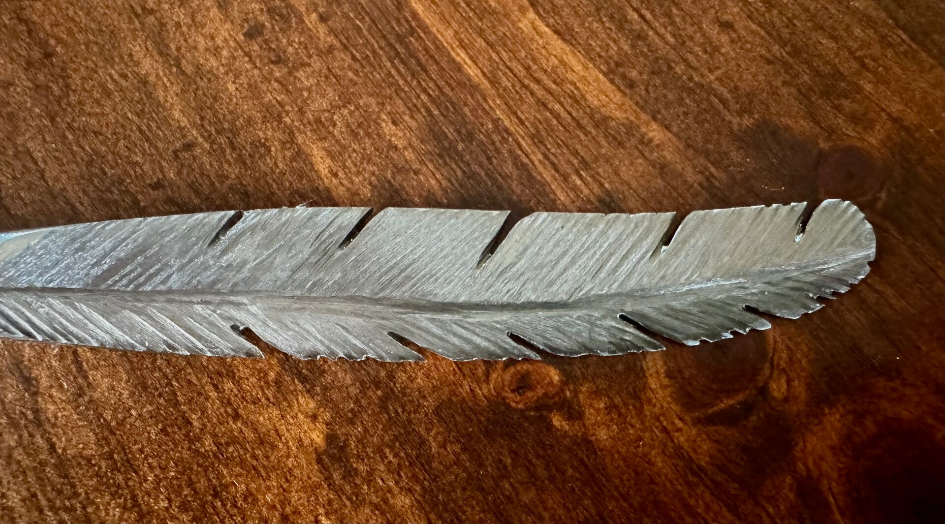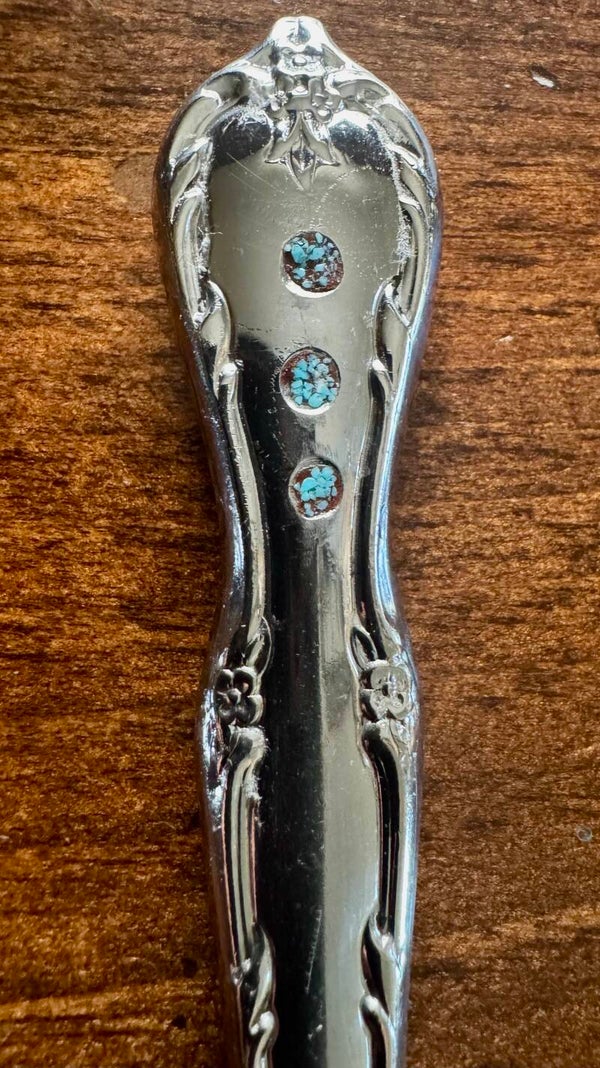 The letter opener is inlayed with natural turquoise and boasts a beautifully hand carved feather blade. Includes the opener and the wooden stand. This would make an amazing gift!